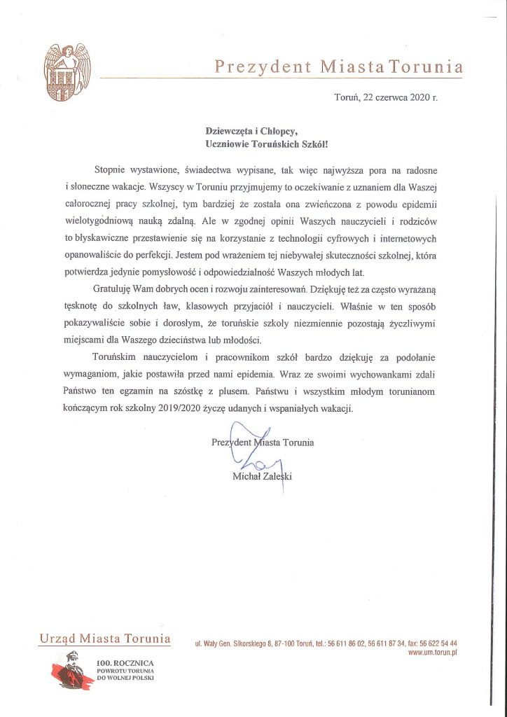 Pismo Prezydenta Miasta Torunia na koniec roku szkolnego