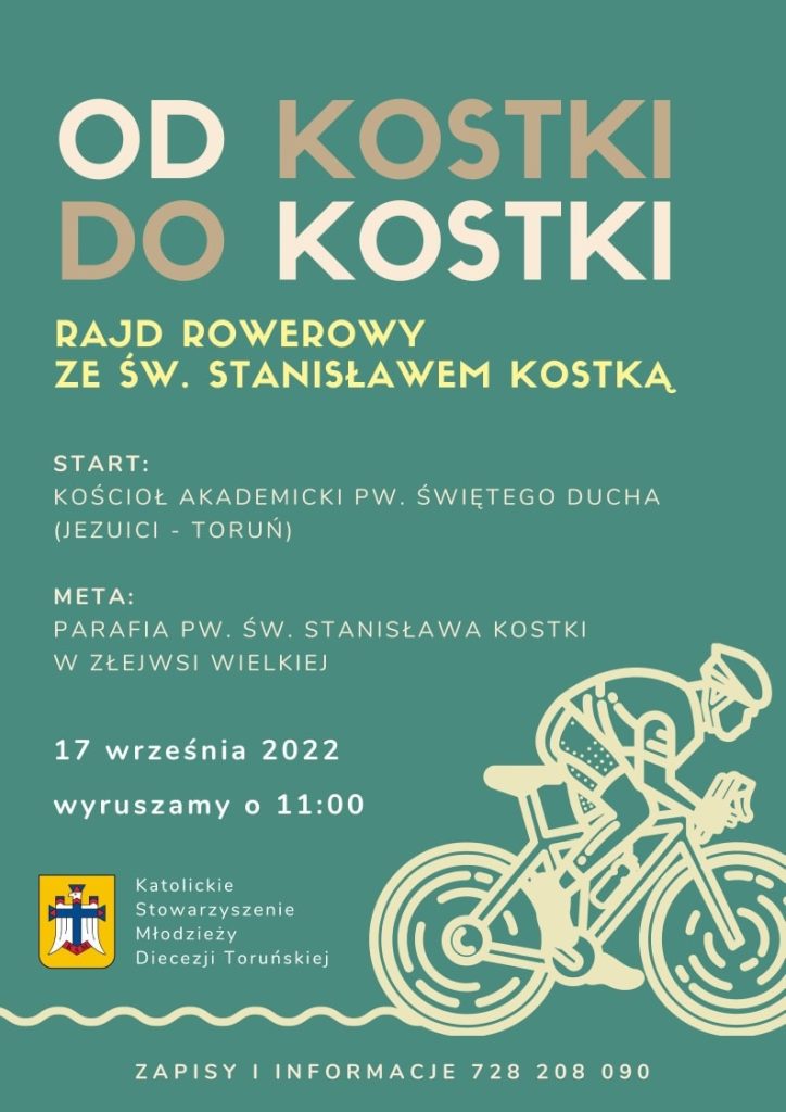 Zapraszamy wszystkich miłośników aktywnego wypoczynku na rowerze na rajd rowerowy ze św. Stanisławem Kostką „Od Kostki do Kostki”, który odbędzie się 17 września i wystartuje o godzinie 11:00 spod kościoła akademickiego Świętego Ducha w Toruniu (JEZUICI).Więcej informacji można uzyskać na plakacie oraz u Pani Doroty Skowrońskiej.
