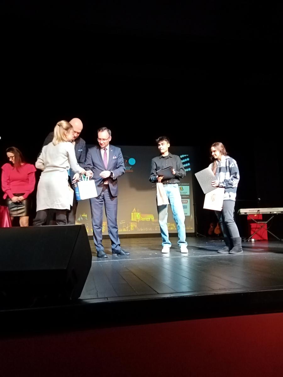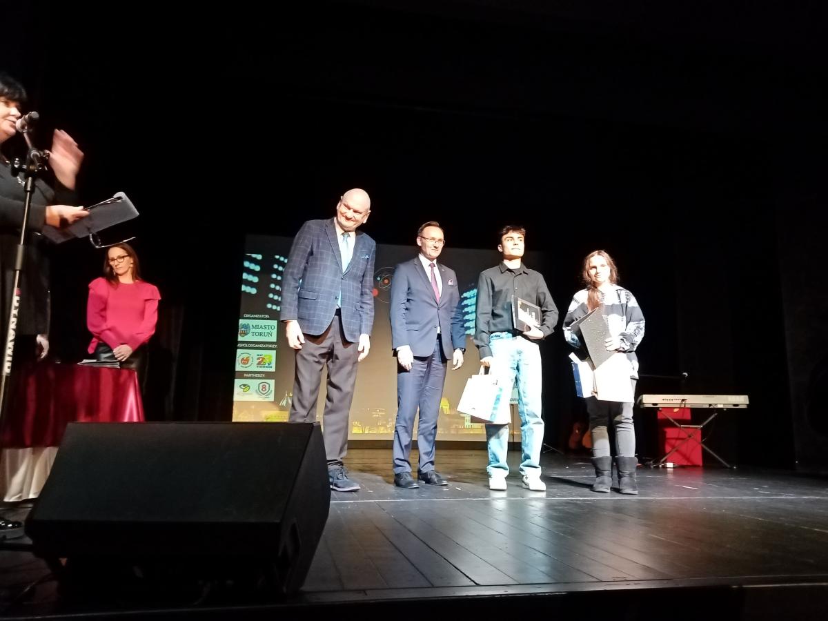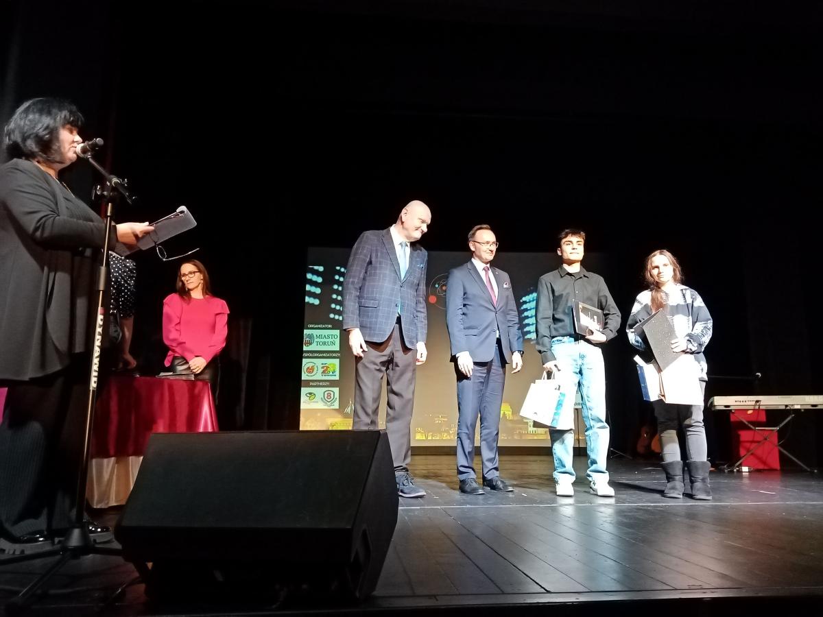 20 listopada w Teatrze Baj Pomorski w Toruniu, podczas gali finałowej konkursu „Gwiazdy Grodu Kopernika”, uczeń naszej szkoły Filip Poumian odebrał nagrodę za projekt logo, które zostało wybrane na znak graficzny promujący powyższe wydarzenie. Nagroda została wręczona przez Prezydenta Torunia Pana Michała Zaleskiego oraz przez Rzecznika Praw Dziecka Pana Mikołaja Pawlaka. Docenione zostały również projekty pozostałych uczniów naszej szkoły, którzy wzięli udział w konkursie na znak graficzny promujący konkurs „Gwiazdy Grodu Kopernika”. Podziękowania za udział otrzymali: Angelika Grabowska, Justyna Wichowska, Weronika Janczukowicz, Justyna Sikorska, Natalia Stachowska oraz Mateusz Krieger.