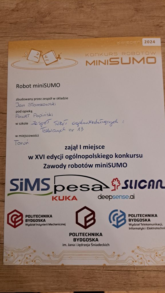 W dniu 18.04.2024 uczeń naszej szkoły Jan Słomkowski (klasa II TGP) wygrał 16. edycję zawodów robotów miniSUMO organizowane przez Politechnikę Bydgoską.