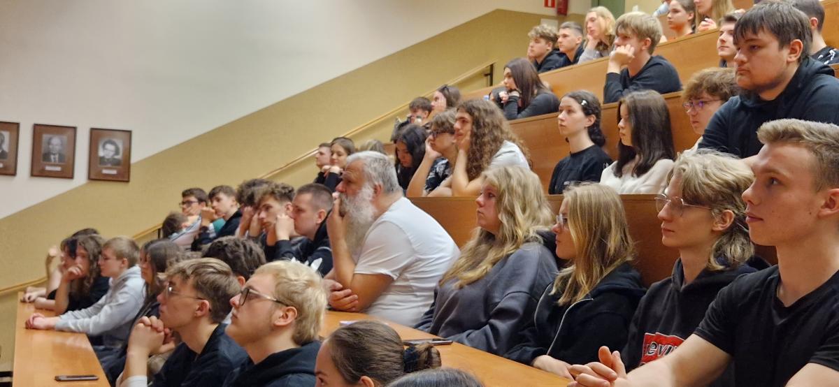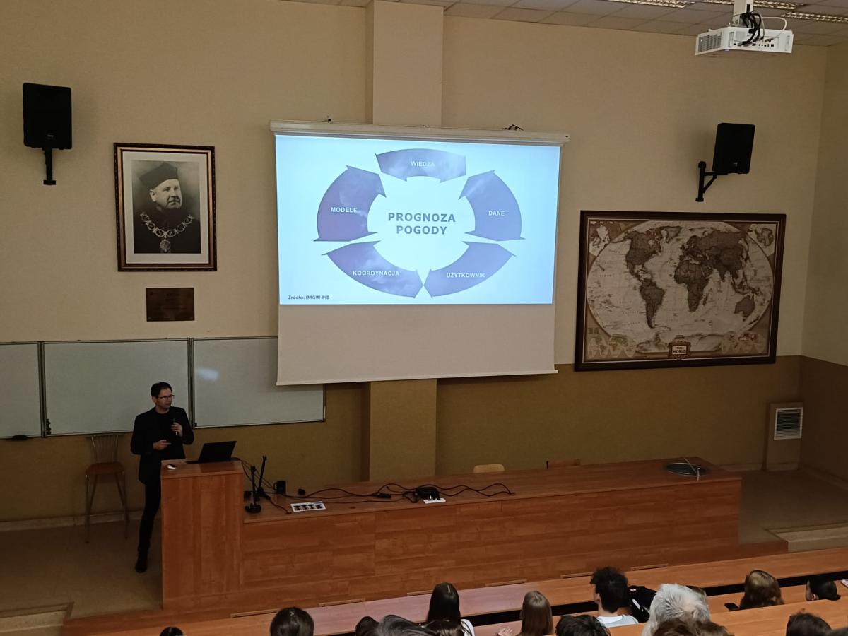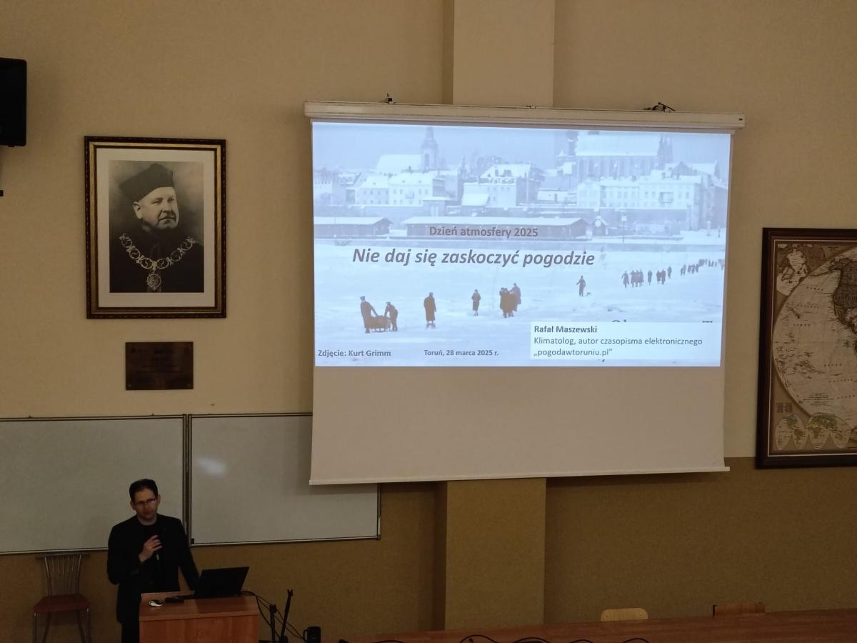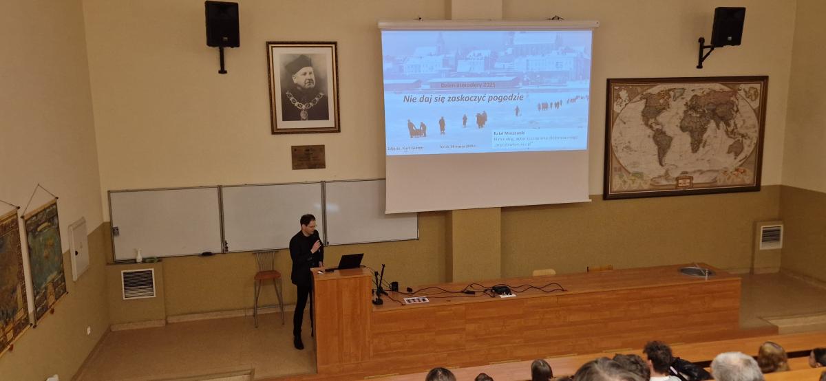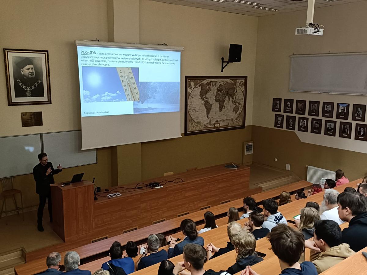 Wydarzenie Dzień Atmosfery na UMK rozpoczęło się wykładem pana Rafała Maszewskiego „Nie daj się zaskoczyć pogodzie”. Co roku UMK organizuje takie otwarte spotkania popularnonaukowe dla młodzieży w ramach Międzynarodowego Dnia Meteorologii. Uczniowie naszych kas II i III LO oraz uczniowie klas III Technikum wzięli udział w wykładzie oraz zwiedzaniu Obserwatorium Meteorologicznego UMK.