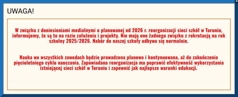 W związku z doniesieniami medialnymi o planowanej od 2026 r. reorganizacji sieci szkół w Toruniu, informujemy, że są to na razie założenia i projekty. Nie mają one żadnego związku z rekrutacją na rok szkolny 2025/2026. Nabór do naszej szkoły odbywa się normalnie.